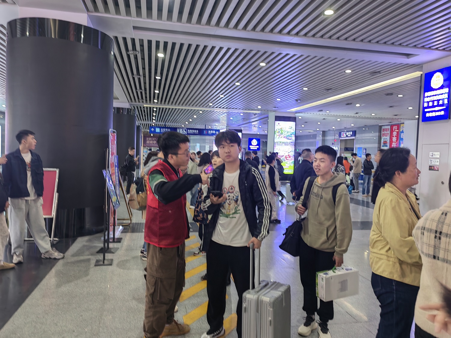 在各服務(wù)站點(diǎn),志愿者們一會兒化身導(dǎo)游,一會兒化身美食家,一會兒化身行李俠……為旅客提供周到的服務(wù),旅客們紛紛點(diǎn)贊志愿者們熱心、舒心、暖心!